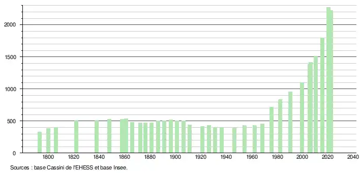 L'évolution du nombre d'habitants est connue à travers les recensements de la population effectués dans la commune depuis 1793. Pour les communes de moins de 10 000 habitants, une enquête de recensement portant sur toute la population est réalisée tous les cinq ans, les populations de référence des années intermédiaires étant quant à elles estimées par interpolation ou extrapolation[13]. Pour la commune, le premier recensement exhaustif entrant dans le cadre du nouveau dispositif a été réalisé en 2005[14].