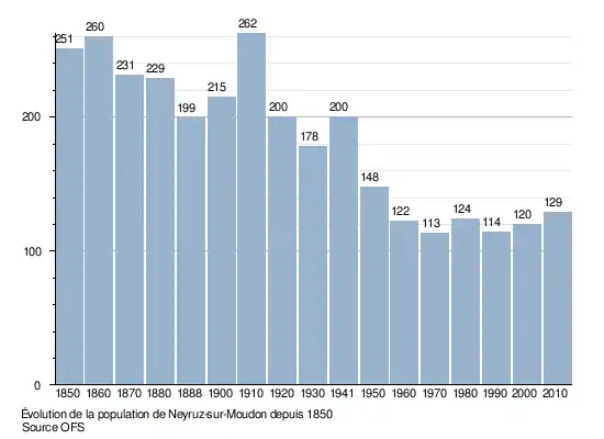 La population de Neyruz-sur-Moudon est de 251 personnes en 1850. Elle descend à 199 personnes en 1888, puis monte à 262 personnes en 1910. Le nombre d'habitants baisse jusqu'à 113 en 1970, puis remonte légèrement jusqu'à 129 en 2010. Le graphique suivant résume l'évolution de la population de Neyruz-sur-Moudon entre 1850 et 2010[5] :