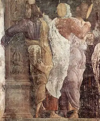 - ↑ exemple typique de panneggio bagnato, technique pour rendre par le clair-obscur les plissés et les drapés sur un corps humain après avoir enduit d'eau et de craie les habits du modèle ou du mannequin.