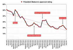 En 2016, le Venezuela connaît sa plus importante sécheresse depuis 40 ans, ce qui perturbe le fonctionnement des centrales hydrauliques et provoque de graves pénuries d'électricité[33]. La même année, le taux d'inflation est estimé entre 300 % par des institutions privées et 720 % par le FMI[34]. Début 2018, le FMI estime l'hyperinflation à 2300 %[35].
