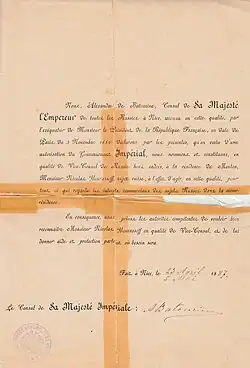 Il est nommé comme vice-consul de Russie à Menton le 5 mai 1887 (23.4.1887 julien)[8] par Alexandre de Batourine consul de sa majesté l'Empereur de toutes les Russies à Nice. Il est également actif au consulat de Russie à Nice.