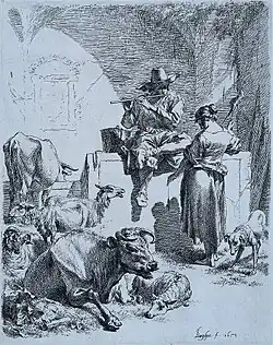 Berchem réalise aussi plusieurs centaines de dessins et cinquante-sept eaux-fortes. Tous comme ses tableaux, il y représente des paysages idylliques et des scènes pastorales[32]. À partir du milieu des années 1650, ses gravures tendent vers une sophistication teintée de classicisme. L'esthétique de la fin de sa carrière inspirera le rococo au siècle suivant[33].