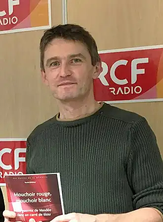 Nicolas Delahaye en 2020 lors de la présentation de son livre "Mouchoir rouge, mouchoir blanc, les guerres de Vendée dans un carré de tissu" sur RCF Vendée dans l'émission En Quête d'Histoire