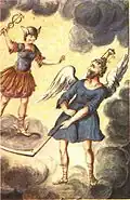 « Un jeune homme avec des ailes aux talons, ayant une verge caducée en main, entortillée de deux serpents, de laquelle il frappait une salade qui lui couvrait la tête, […], contre icelui venait courant et volant à ailes ouvertes, un grand vieillard, lequel sur sa tête avait une horloge attachée, et en ses mains une faux comme la mort, de laquelle terrible et furieux, il voulait trancher les pieds à Mercure »[75].