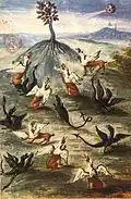 « Une belle fleur en la sommité d'une montagne très haute, que l'aquilon ébranlait fort rudement, elle avait le pied bleu, les fleurs blanches et rouges, les feuilles reluisantes comme l'or fin, à l'entour de laquelle des dragons et griffons aquiloniens faisaient leur nid et demeurance »[75].