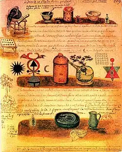 Le mythe de Nicolas Flamel alchimiste est le résultat de plusieurs phénomènes de la tradition alchimique. Tout d'abord, à partir du XVe siècle, la croyance en l'origine alchimique de certaines fortunes bourgeoises du Moyen Âge : outre Flamel (le plus connu), ce fut le cas de Jacques Cœur (c. 1400-1456)[30], de Nicolas le Valois (c. 1495-c.1542) (la plus grosse fortune de Caen et fondateur de l'hôtel d'Escoville)[31], ou encore du marchand allemand Sigmund Wann (de) (c. 1395-1469)[32]. Ensuite la pseudépigraphie, par laquelle on attribua des traités alchimiques à des autorités antiques (Aristote, Hermès Trismégiste, etc.) ou médiévales (Albert le Grand, Thomas d'Aquin, Raymond Lulle, Arnaud de Villeneuve…), pour compenser « la marginalité d'une discipline qui ne fut jamais vraiment intégrée au savoir universitaire »[29]. Enfin, avec la Renaissance, « le recours au langage allégorique et au symbolisme pictural devient systématique » dans les textes alchimiques ; cela entraîne, à partir du milieu du XVIe siècle une « exégèse alchimique » qui recherche un sens caché tant dans les textes bibliques que dans les récits de la mythologie gréco-romaine (notamment la légende de la Toison d'or), et enfin dans les décorations symboliques de l'architecture médiévale[29].