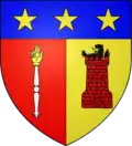 Parti, au 1 de gueules à une main de justice d'argent montée d'or; au 2, d'or à la tour de gueules, sommée d'un lion naissant de sable; au chef d'azur, brochant sur le parti et chargé de trois étoiles d'or[5] |
