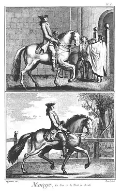 Manège, Le Pas et le Trot à droite, Encyclopédie ou Dictionnaire raisonné des sciences, des arts et des métiers, 1769.
