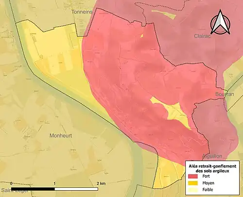 Le retrait-gonflement des sols argileux est susceptible d'engendrer des dommages importants aux bâtiments en cas d’alternance de périodes de sécheresse et de pluie[19]. La totalité de la commune est en aléa moyen ou fort (91,8 % au niveau départemental et 48,5 % au niveau national)[Carte 2]. Depuis le , en application de la loi ELAN, différentes contraintes s'imposent aux vendeurs, maîtres d'ouvrages ou constructeurs de biens situés dans une zone classée en aléa moyen ou fort[Note 3],[20].