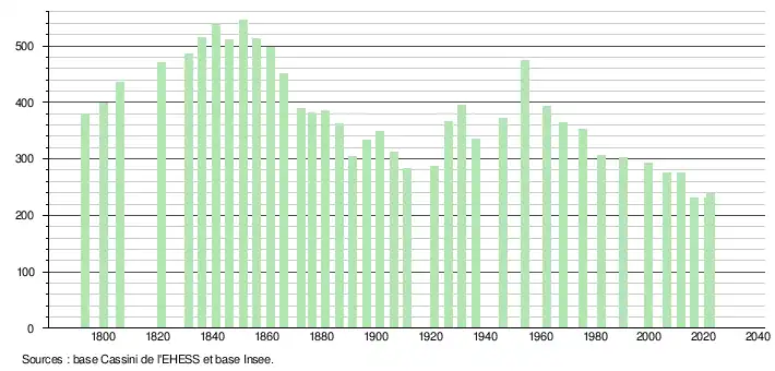 L'évolution du nombre d'habitants est connue à travers les recensements de la population effectués dans la commune depuis 1793. Pour les communes de moins de 10 000 habitants, une enquête de recensement portant sur toute la population est réalisée tous les cinq ans, les populations de référence des années intermédiaires étant quant à elles estimées par interpolation ou extrapolation[24]. Pour la commune, le premier recensement exhaustif entrant dans le cadre du nouveau dispositif a été réalisé en 2006[25].