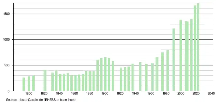 L'évolution du nombre d'habitants est connue à travers les recensements de la population effectués dans la commune depuis 1793. Pour les communes de moins de 10 000 habitants, une enquête de recensement portant sur toute la population est réalisée tous les cinq ans, les populations de référence des années intermédiaires étant quant à elles estimées par interpolation ou extrapolation[18]. Pour la commune, le premier recensement exhaustif entrant dans le cadre du nouveau dispositif a été réalisé en 2008[19].