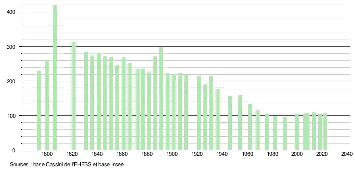 L'évolution du nombre d'habitants est connue à travers les recensements de la population effectués dans la commune depuis 1793. Pour les communes de moins de 10 000 habitants, une enquête de recensement portant sur toute la population est réalisée tous les cinq ans, les populations de référence des années intermédiaires étant quant à elles estimées par interpolation ou extrapolation[12]. Pour la commune, le premier recensement exhaustif entrant dans le cadre du nouveau dispositif a été réalisé en 2008[13].