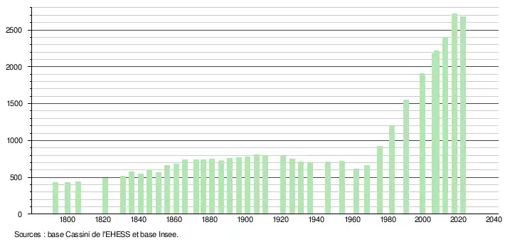 L'évolution du nombre d'habitants est connue à travers les recensements de la population effectués dans la commune depuis 1793. Pour les communes de moins de 10 000 habitants, une enquête de recensement portant sur toute la population est réalisée tous les cinq ans, les populations de référence des années intermédiaires étant quant à elles estimées par interpolation ou extrapolation[30]. Pour la commune, le premier recensement exhaustif entrant dans le cadre du nouveau dispositif a été réalisé en 2007[31].