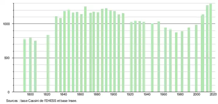 L'évolution du nombre d'habitants est connue à travers les recensements de la population effectués dans la commune depuis 1793. Pour les communes de moins de 10 000 habitants, une enquête de recensement portant sur toute la population est réalisée tous les cinq ans, les populations de référence des années intermédiaires étant quant à elles estimées par interpolation ou extrapolation[8]. Pour la commune, le premier recensement exhaustif entrant dans le cadre du nouveau dispositif a été réalisé en 2007[9].