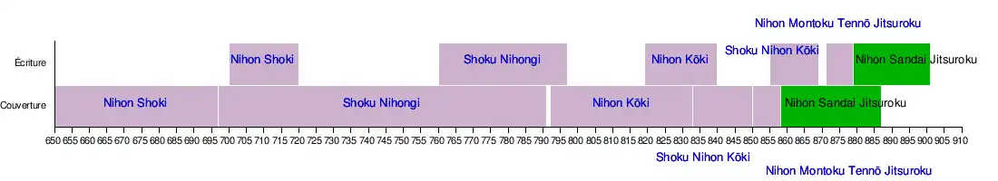 - Ruijū kokushi, un manuel d'histoire chronologique et par catégories qui permet de reconstituer les parties manquantes du texte des Nihon sandai jitsuroku