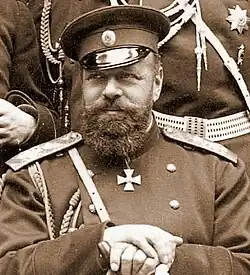 Alexandre III, le tsar pacificateur (1845—1894), a mené fermement la réforme de l'Académie russe des beaux-arts. C'est un fin connaisseur en matière de peinture qui possède une belle collection d'œuvres d'art russes et étrangères. Peu de temps avant sa mort, il décide de créer à Saint-Pétersbourg, à l'exemple de Pavel Tretiakov, un musée d'art russe et de lui faire don des œuvres russes de sa collection. En 1898, a lieu l'inauguration du musée russe Alexandre III qui porte le nom de Musée russe depuis 1917. Photo vers 1880—1890.Vladimir Alexandrovitch de Russie (1847—1909) est le frère du tsar. Il est président du Musée russe[24],[Note. 15]Vladimir Alexandrovitch commande aussi la garde impériale et le district militaire de Saint-Pétersbourg (1884—1905). C'est un grand amateur de peinture et de littérature, possédant incontestablement des talents artistiques. Il s'adonne lui-même à la peinture. Il s'intéresse aussi aux ballets et est le premier à financer la tournée de Serge de Diaghilev[25] Photographie des années 1890.