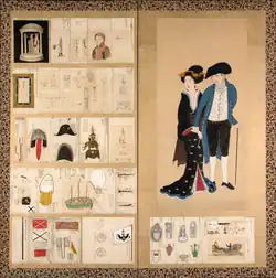 Paravent japonais montrant Nikolaï Petrovitch Rezanov et une femme japonaise à droite et des objets liés à son ambassade à gauche et en bas à droite
