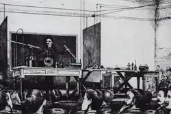 Les travaux de Tesla se concentrent alors sur la haute fréquence, et plus particulièrement sur la conversion d'électricité en lumière, alors que Guglielmo Marconi, un autre inventeur, a développé les théories de Hertz pour des utilisations en télécommunications. Afin de promouvoir ses découvertes, Tesla utilise ce qu'il a appris avec Peck et Brown : il publie plusieurs articles dans des journaux spécialisés, pose des brevets sur ses inventions et donne une série de conférences dans des universités et écoles d'ingénieurs. Lors de démonstrations publiques pour un système d'éclairage, il allume des tubes de Geissler et des ampoules à incandescence sans utiliser de fils[119]. En 1893, Tesla déclare aux spectateurs de plusieurs conférences qu'il est sûr qu'un système comme le sien pourrait éventuellement conduire « des signaux intelligibles ou peut-être même de l'énergie à n'importe quelle distance sans utiliser de fils » en le conduisant à travers la terre[120],[121]. Tesla entre également en conflit avec Elihu Thomson, qui travaille sur la haute fréquence et n'observe pas toujours les mêmes résultats que lui ; Tesla et Thomson se répondent par une série d'articles dans des journaux spécialisés entre et [122].