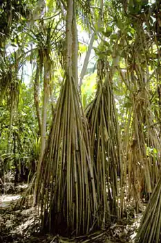 - La strate arborée "naturelle" est faite d'arbres épars comme le Tournefortia argentea[16] (6 à 10 m de hauteur), de bosquets de Pisonia grandis[17] (20 m de hauteur), de Cordia subcordata[18] (Kanawa trees) et des Pandanus sp.... Cette strate a été défrichée lors de la colonisation de l'île en 1938 et des cocotiers ont été plantés en vue de produire du coprah.