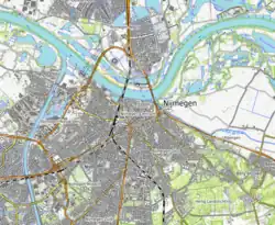 Nimègue se trouve à l'origine sur la rive gauche du Waal et, depuis le creusement du canal de la Meuse au Waal en 1927, à l'est de ce canal.