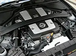 Moteur : VQ37VHR, 6 cylindres en V à 60° 3 696 cm3, 24 soupapes, position longitudinale central avant, gestion électronique Nissan EGI ECCS, 331 ch à 7 500 tr/min et 366 N m à 5 200 tr/min, Alésage x course (mm) : 95,5 x 86.