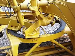 Le groupe motopropulseur situé à l'arrière comporte généralement quatre roues motrices égales (rarement deux) montées sur tandem oscillant. Elles sont solidarisées de chaque côté par des transmissions à chaîne et sont entraînées par un moteur puissant (par exemple 250 chevaux pour une machine de 25 tonnes à lame de 4,5 m)[4]. Les roues avant peuvent être rendues motrices par transmission hydraulique.