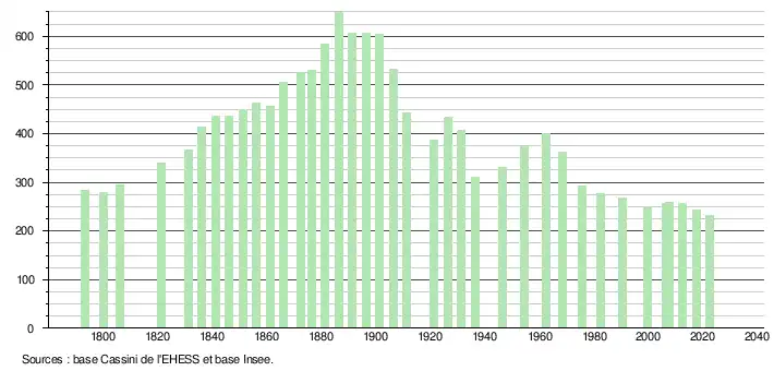 L'évolution du nombre d'habitants est connue à travers les recensements de la population effectués dans la commune depuis 1793. Pour les communes de moins de 10 000 habitants, une enquête de recensement portant sur toute la population est réalisée tous les cinq ans, les populations de référence des années intermédiaires étant quant à elles estimées par interpolation ou extrapolation[25]. Pour la commune, le premier recensement exhaustif entrant dans le cadre du nouveau dispositif a été réalisé en 2007[26].
