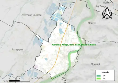 Le réseau Natura 2000 est un réseau écologique européen de sites naturels d'intérêt écologique élaboré à partir des directives habitats et oiseaux, constitué de zones spéciales de conservation (ZSC) et de zones de protection spéciale (ZPS)[Note 2]. Un site Natura 2000 a été défini sur la commune au titre de la directive habitats : « Garonne, Ariège, Hers, Salat, Pique et Neste »[22], d'une superficie de 9 581 ha, un réseau hydrographique pour les poissons migrateurs (zones de frayères actives et potentielles importantes pour le Saumon en particulier qui fait l'objet d'alevinages réguliers et dont des adultes atteignent déjà Foix sur l'Ariège[23].