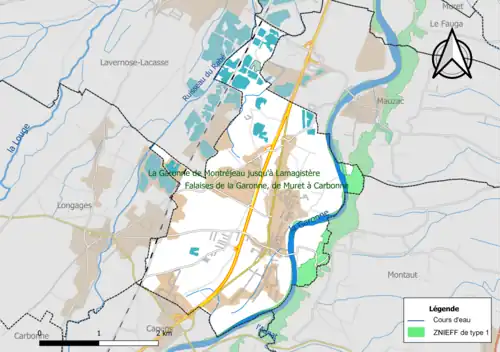 L’inventaire des zones naturelles d'intérêt écologique, faunistique et floristique (ZNIEFF) a pour objectif de réaliser une couverture des zones les plus intéressantes sur le plan écologique, essentiellement dans la perspective d’améliorer la connaissance du patrimoine naturel national et de fournir aux différents décideurs un outil d’aide à la prise en compte de l’environnement dans l’aménagement du territoire. Deux ZNIEFF de type 1[Note 3] sont recensées sur la commune[24] : les « falaises de la Garonne, de Muret à Carbonne » (525 ha), couvrant 8 communes du département[25] et « la Garonne de Montréjeau jusqu'à Lamagistère » (5 075 ha), couvrant 92 communes dont 63 dans la Haute-Garonne, trois dans le Lot-et-Garonne et 26 dans le Tarn-et-Garonne[26] et une ZNIEFF de type 2[Note 4],[24] : « la Garonne et milieux riverains, en aval de Montréjeau » (6 874 ha), couvrant 93 communes dont 64 dans la Haute-Garonne, trois dans le Lot-et-Garonne et 26 dans le Tarn-et-Garonne[27].