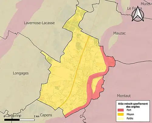 La commune est vulnérable au risque de mouvements de terrains constitué principalement du retrait-gonflement des sols argileux[32]. Cet aléa est susceptible d'engendrer des dommages importants aux bâtiments en cas d’alternance de périodes de sécheresse et de pluie. La totalité de la commune est en aléa moyen ou fort (88,8 % au niveau départemental et 48,5 % au niveau national). Sur les 1 134 bâtiments dénombrés sur la commune en 2019, 1 134 sont en aléa moyen ou fort, soit 100 %, à comparer aux 98 % au niveau départemental et 54 % au niveau national. Une cartographie de l'exposition du territoire national au retrait gonflement des sols argileux est disponible sur le site du BRGM[33],[Carte 3].