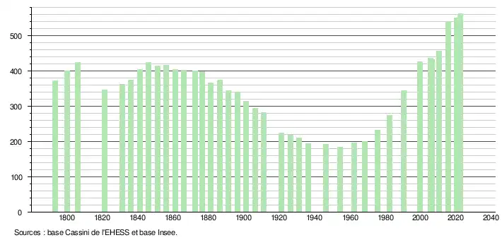 L'évolution du nombre d'habitants est connue à travers les recensements de la population effectués dans la commune depuis 1793. Pour les communes de moins de 10 000 habitants, une enquête de recensement portant sur toute la population est réalisée tous les cinq ans, les populations de référence des années intermédiaires étant quant à elles estimées par interpolation ou extrapolation[14]. Pour la commune, le premier recensement exhaustif entrant dans le cadre du nouveau dispositif a été réalisé en 2005[15].
