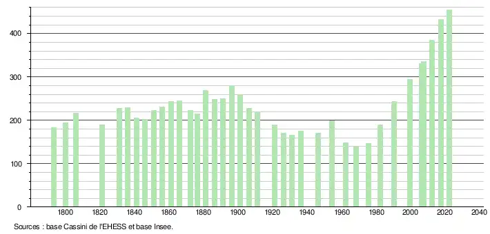 L'évolution du nombre d'habitants est connue à travers les recensements de la population effectués dans la commune depuis 1793. Pour les communes de moins de 10 000 habitants, une enquête de recensement portant sur toute la population est réalisée tous les cinq ans, les populations de référence des années intermédiaires étant quant à elles estimées par interpolation ou extrapolation[16]. Pour la commune, le premier recensement exhaustif entrant dans le cadre du nouveau dispositif a été réalisé en 2007[17].