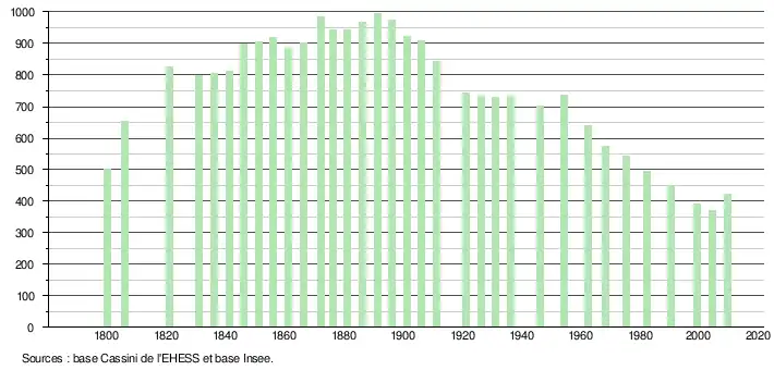L'évolution du nombre d'habitants est connue à travers les recensements de la population effectués dans la commune depuis 1800. À partir du , les populations légales des communes sont publiées annuellement dans le cadre d'un recensement qui repose désormais sur une collecte d'information annuelle, concernant successivement tous les territoires communaux au cours d'une période de cinq ans. Pour les communes de moins de 10 000 habitants, une enquête de recensement portant sur toute la population est réalisée tous les cinq ans, les populations légales des années intermédiaires étant quant à elles estimées par interpolation ou extrapolation[11]. Pour la commune, le premier recensement exhaustif entrant dans le cadre du nouveau dispositif a été réalisé en 2004[12],[Note 1].