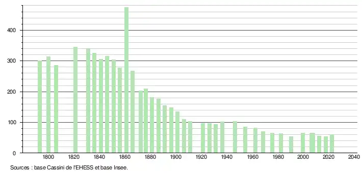 L'évolution du nombre d'habitants est connue à travers les recensements de la population effectués dans la commune depuis 1793. Pour les communes de moins de 10 000 habitants, une enquête de recensement portant sur toute la population est réalisée tous les cinq ans, les populations de référence des années intermédiaires étant quant à elles estimées par interpolation ou extrapolation[21]. Pour la commune, le premier recensement exhaustif entrant dans le cadre du nouveau dispositif a été réalisé en 2007[22].