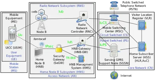 Dans les environnements résidentiels ou en entreprise, une variante de faible puissance (typiquement 20 mW) appelée « HNB » (Home Node B) permet de constituer des cellules radio de faibles tailles les « Femtocells » qui peuvent compléter les macro-cellules des Node B traditionnels.