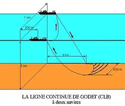 Une version à deux bateaux[31] comportait une boucle de 10 km mise en œuvre par deux navires se déplaçant à 1,5 nœud (2,8 km/h). Cette boucle était constituée de fibres synthétiques à forte résistance mécanique et de masse apparente nulle dans l'eau. Elle supportait tous les 30 m des godets. Ceux-ci, au cours de la rotation de la boucle, venaient draguer le fond sur une distance de 100 m à la vitesse de 1 à 2 m/s. Ce système très simple présentait le défaut de ne pouvoir assurer le contrôle de la trajectoire des godets sur le fond pour réaliser des passes jointives. Le taux de récupération des nodules risquait par conséquent d'être médiocre. Le système à deux bateaux n'a pu être testé par manque de financement et l'étude a été définitivement abandonnée en 1978.