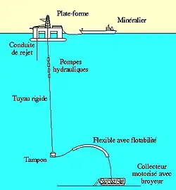 Le principe de ce système hydraulique est un ramassage des nodules à l'aide d'un engin, appelé collecteur, se déplaçant sur le fond. La remontée du minerai s'effectue à travers un tuyau rigide relié à un support de surface qui peut être une plate-forme, une barge, un bateau.