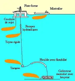- – système hydraulique (hydraulic-lift) : Des pompes hydrauliques sont posées à différents niveaux du tuyau créant un flux d'eau ascendant entrainant les nodules vers la surface ;