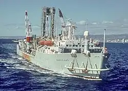 - OMCO loue à la marine américaine le fameux Glomar Explorer pour tester le module de collecte se déplaçant sur le fond à l'aide d'une vis d'Archimède. En 1979, 50 tonnes de nodules ont été prélevés. Ironiquement, la plus célèbre tentative d'exploitation constitue en fait un rideau de fumée visant à dissimuler une opération d'espionnage. Howard Hughes affréta en 1972 le Glomar Explorer, officiellement pour prospecter les nodules polymétalliques. En fait il s'agissait de récupérer un sous-marin nucléaire soviétique coulé dans l'océan Pacifique en 1968. L'histoire ne dit pas ce qu'il est advenu du sous-marin[33].