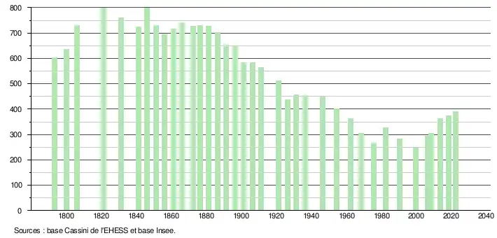 L'évolution du nombre d'habitants est connue à travers les recensements de la population effectués dans la commune depuis 1793. Pour les communes de moins de 10 000 habitants, une enquête de recensement portant sur toute la population est réalisée tous les cinq ans, les populations de référence des années intermédiaires étant quant à elles estimées par interpolation ou extrapolation[27]. Pour la commune, le premier recensement exhaustif entrant dans le cadre du nouveau dispositif a été réalisé en 2008[28].