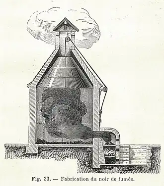 - d'hydrocarbures de goudron, produisant du noir de fumée (ou noir de lampe, ou lamp black) (particules de 50–100 nm de diamètre),