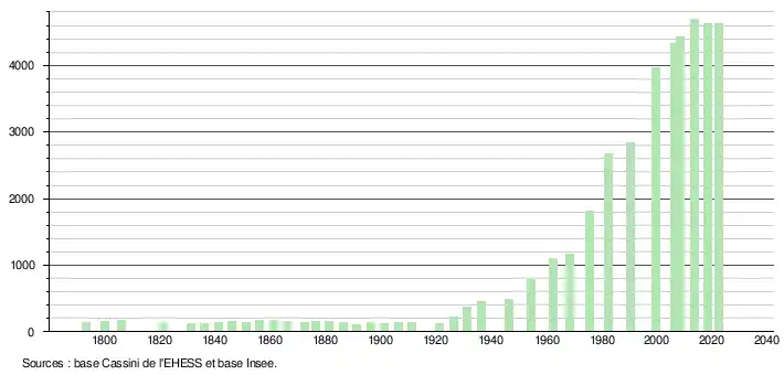 L'évolution du nombre d'habitants est connue à travers les recensements de la population effectués dans la commune depuis 1793. Pour les communes de moins de 10 000 habitants, une enquête de recensement portant sur toute la population est réalisée tous les cinq ans, les populations de référence des années intermédiaires étant quant à elles estimées par interpolation ou extrapolation[22]. Pour la commune, le premier recensement exhaustif entrant dans le cadre du nouveau dispositif a été réalisé en 2008[23].