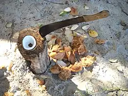 Pour ouvrir une noix de coco, il faut la débarrasser de sa bourre. C'est une opération quasi impossible à réaliser à la main ou même à l'aide d'un couteau. Une machette ou une hache peuvent être utilisées, mais pour ôter cette carapace sans casser la noix, le mieux est de l'empaler sur un pieu, de préférence en métal, fixé au sol afin de déchirer la gangue coriace dont l'épaisseur avoisine les 7-8 mm.