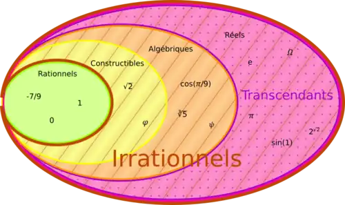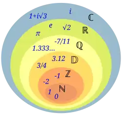 En l’absence d’une définition générale satisfaisante de cette notion[2], divers types de nombres ont été introduits, des entiers naturels aux nombres réels, et encore au-delà avec d’autres objets comme les nombres complexes[3], les nombres p-adiques[4], des infinitésimaux de l’analyse non standard ou des transfinis de la théorie des ensembles. Ces concepts permettant d’exprimer des mesures physiques, résoudre des équations, encoder des informations, voire appréhender l’infini.
