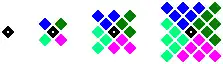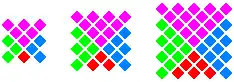 - La dernière égalité est représentée ci-dessous pour n = 1, 2, 3, et 4 ; la n-ième figure est formée en considérant un carré de 2n – 1 points par 2n – 1 points, et en sélectionnant la moitié des points : à partir du coin supérieur gauche, jusqu'au point central inclus.[réf. souhaitée]