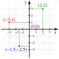 Un nombre réel est un nombre que l'on peut représenter comme un point sur un axe à une dimension. On trouve le zéro, les nombres entiers naturels comme le zéro, 1, 2, 3..., les nombres relatifs négatifs comme –1, –2, –3,..., les nombres rationnels comme 2/3, 4/9, –8/11, etc., et d'autres nombres réels comme 2 (racine de 2). Vu que l'espace est en une dimension (c'est une ligne), un tel nombre réel se représente par une seule coordonnée : le nombre lui-même.