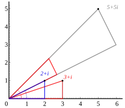 Multiplication de 3 + i (triangle rouge) par 2 + i (triangle bleu). Le triangle rouge tourne pour venir se positionner sur l'hypoténuse du triangle bleu puis est agrandi d'un facteur 5 correspondant à la longueur de l'hypoténuse du triangle bleu.
