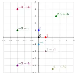 En mathématiques, l'ensemble des nombres complexes est actuellement défini comme une extension de l'ensemble des nombres réels, contenant en particulier un nombre imaginaire noté i[a],[b] tel que i2 = −1. Le carré de (−i) est aussi égal à −1 : (−i)2 = −1. Tout nombre complexe peut s'écrire sous la forme x + i yx et y sont des nombres réels.