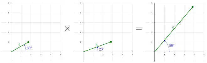 Considérons 2+3i. Multiplier par 2 ce nombre consiste à doubler le vecteur partant de l'origine finissant au point d’abscisse 2 et d'ordonnée 3. On obtient le nombre complexe 4+6i. Bref, multiplier par un nombre réel revient à allonger/rétrécir/changer de sens le vecteur associé au point. Multiplier par un nombre complexe est plus subtil. Cela revient non seulement à allonger/rétrécir le vecteur mais aussi à le pivoter. Plus précisément, pour chaque nombre complexe (i.e. un point du plan), on considère l'angle entre l'axe des abscisses et le vecteur correspondant à la flèche partant de l'origine finissant en ce point. L'exemple ci-dessous considère deux nombres complexes. L'un est obtenu en avançant d'une distance de 2 avec un angle de 30°, et l'autre en avançant de 3 avec un angle de 20°. Le produit de ces deux nombres est le point obtenu en avançant de 6 (2 fois 3) avec un angle de 50° (20° + 30°).