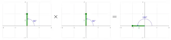 Multiplication de i par lui-même. La distance à l'origine est de 1. Les angles formés avec l'axe des abscisses s'additionnent.